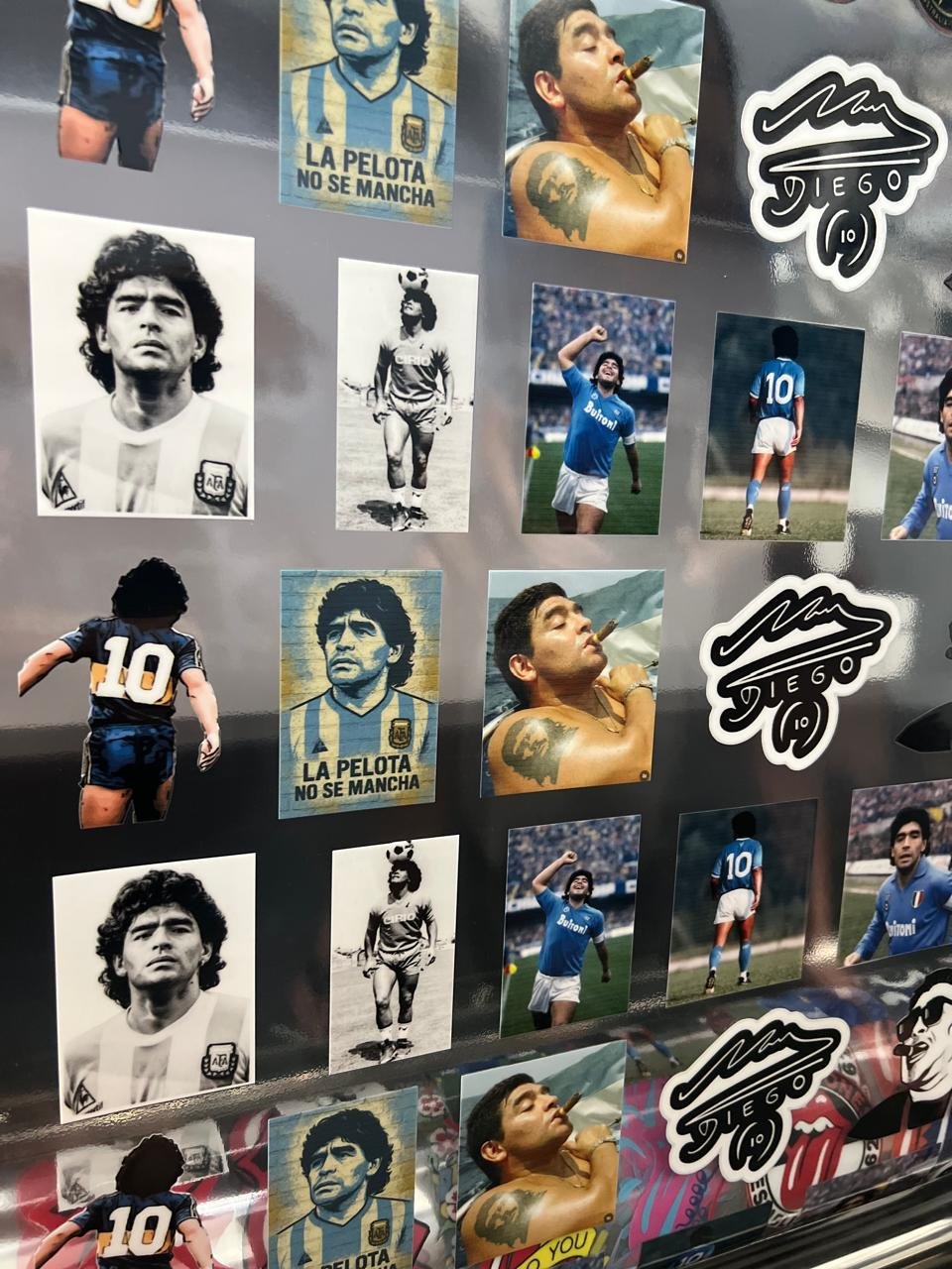 Maradona Plancha III de 48 Stickers Premium DTF UV Pro laqueados de 7 cm de alto cada uno.
